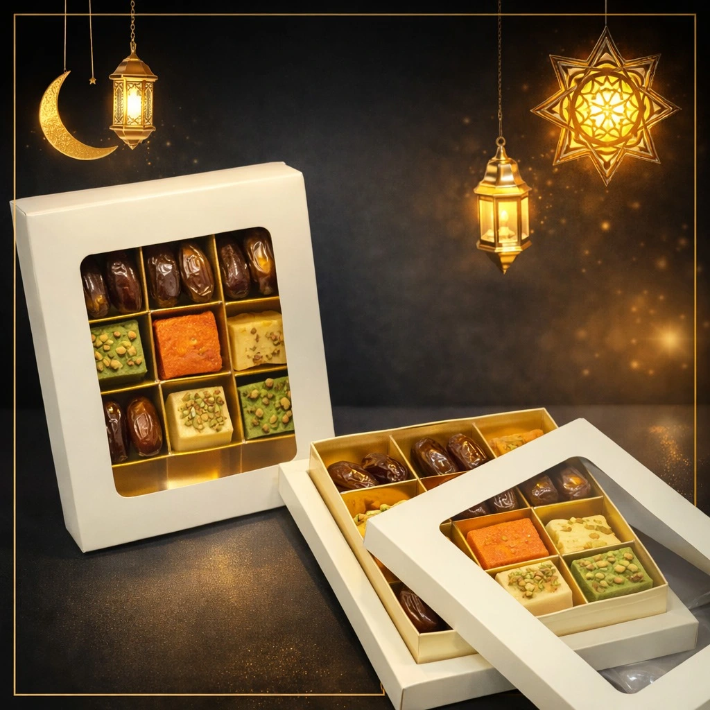 Date packaging (Ajwa, Medjool, Mabroom), chocolates & truffles, bakery treats, Ramadan & Eid gift boxes, wedding favors & corporate giveaways
