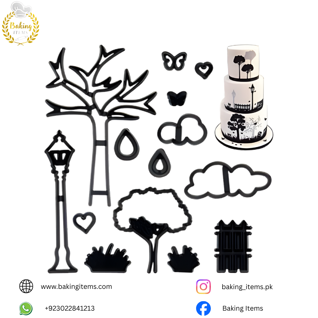 Our Garden Theme Cutter Set is perfect for creating elegant outdoor, fairy garden & nature-themed cake designs. This cutter set includes multiple shapes like trees, clouds, lamp post, hearts, butterflies, leaves and bushes — ideal for birthday cakes, wedding cakes, engagement cakes, baby showers & themed desserts.